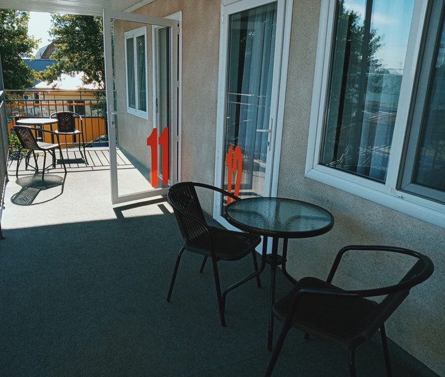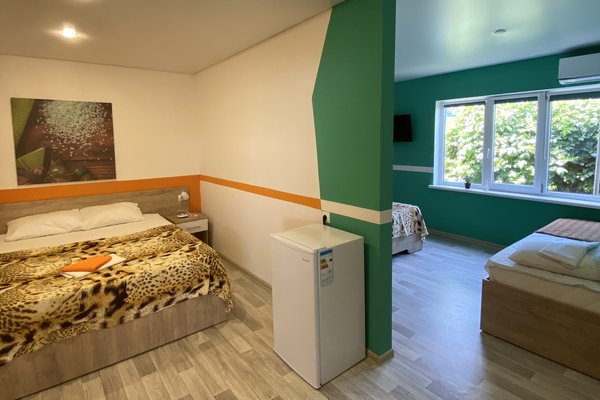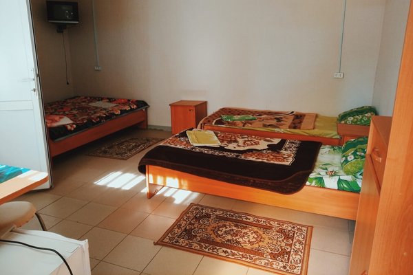 5-ти местный номер семейный: две двуспальные кровати + одна односпальная кровать, телевизор, холодильник, кондиционер, сан.узел, душ с горячей и холодной водой, стол и стулья, посуда, полотенца. Новый обновленный ремонт.